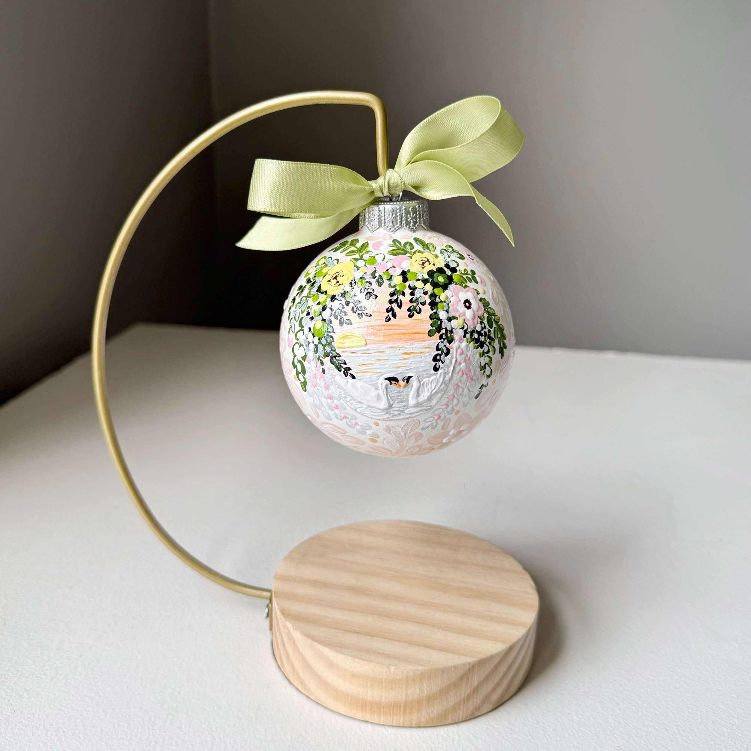One-of-a-kind ceramic ornament, inspired by the original oil pastel painting Blooming Serene Swans. Hand-painted with acrylic paints, sealed with a varnish to protect for years to come.